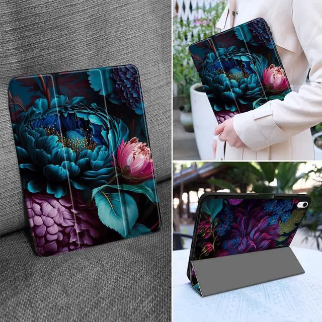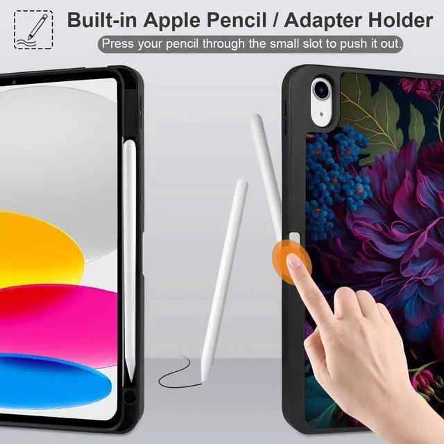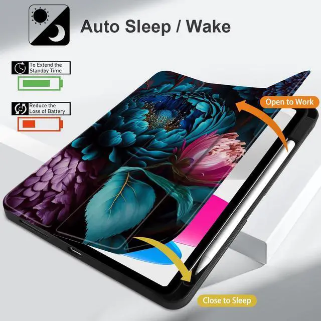 MEEgoodo Case for iPad A16 11th Generation 11 inch 2025/iPad 10th Generation 10.9 inch 2022, Tablet Cover with Trifold Stand + Pencil Holder + Auto Wake/Sleep + TPU Back Cover, Beautiful Fantasy Flower