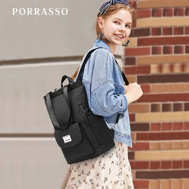 PORRASSO Women Laptop Backpack Casual Shoulder Bag with USB Charging Port Luggage Strap for 15.6 Inch Laptop Daypack College Work Travel Rucksack Black