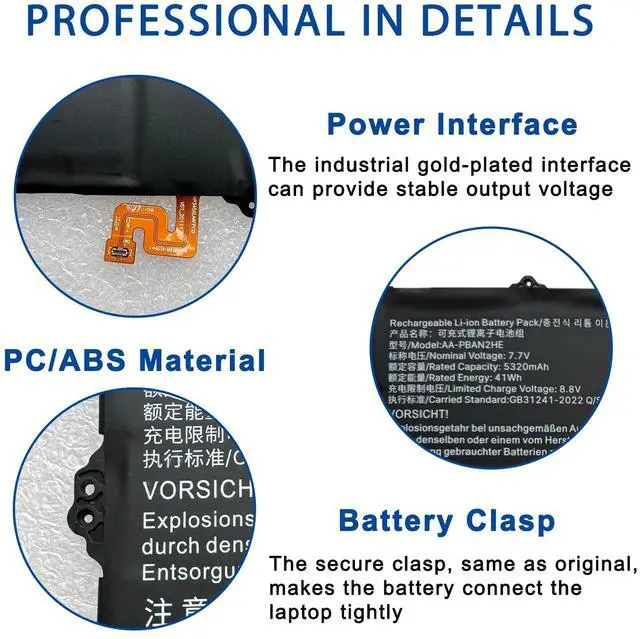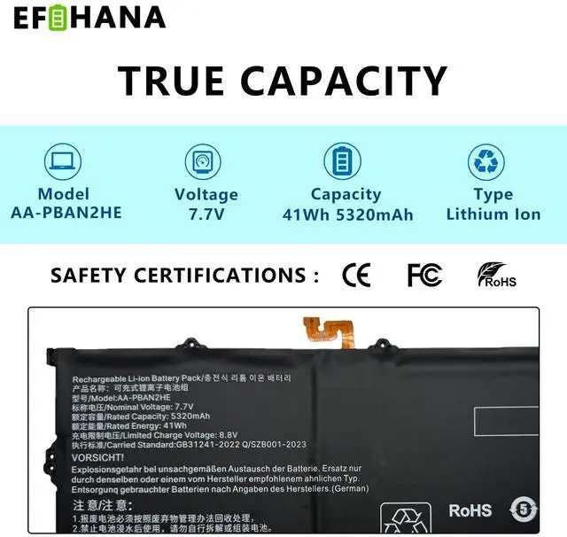 SpecificationsModel:AA-PBAN2HE// Battery type: Li-ion // Voltage:7.7V // Capacity:41Wh 5320mAh // 100% New from Manufacturer. Top circuit boards and smart chip.