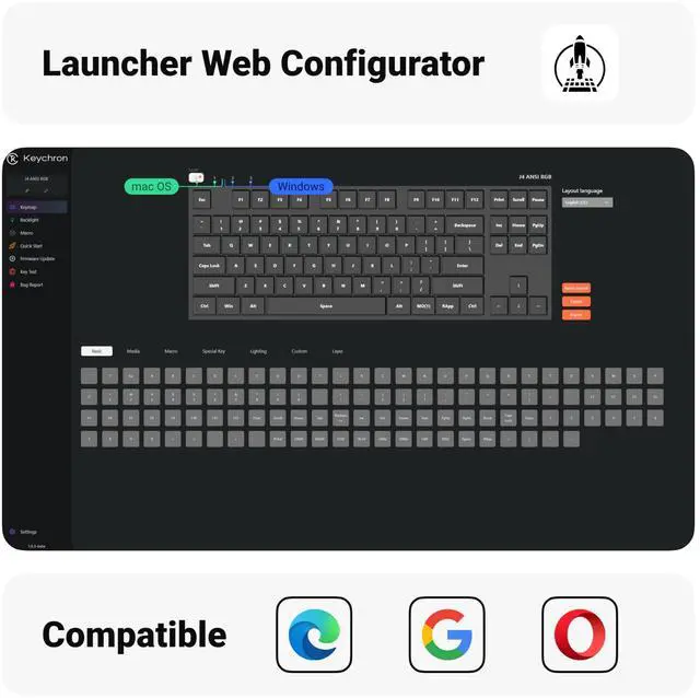 Program with QMK & Launcher: Customize your layout using QMK firmware and the web-based Launcher. Effortlessly remap keys, create macros, and adjust settings directly in your browserno software installation required.