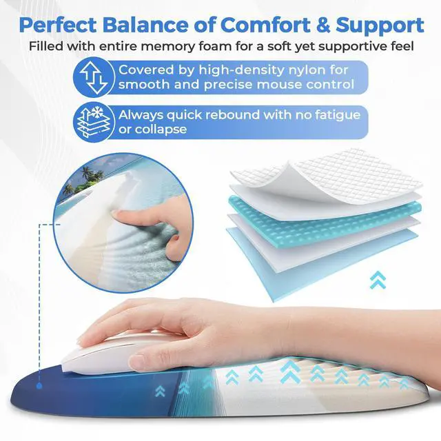 HIGH QUALITY COMPONENT: It composed of 100% memory foam under smooth fabric cloth. Human hands and skin feel super comfortable on it. Its grippy because of its Anti-slip PU base.