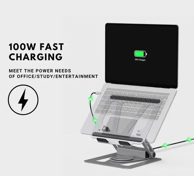 360° ROTATABLE & ADJUSTABLE - Experience ultimate versatility with this laptop stand. Adjust freely to the preferred height and viewing angle to reduce neck and back stiffness. Easy to carry around with foldable design. Prolong the service life of laptops with the ventilation openings. Perfectly combine USB-C dock and laptop stand for effortless screen sharing with friends or colleagues.