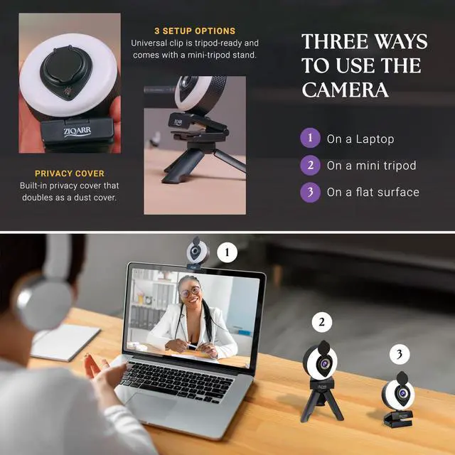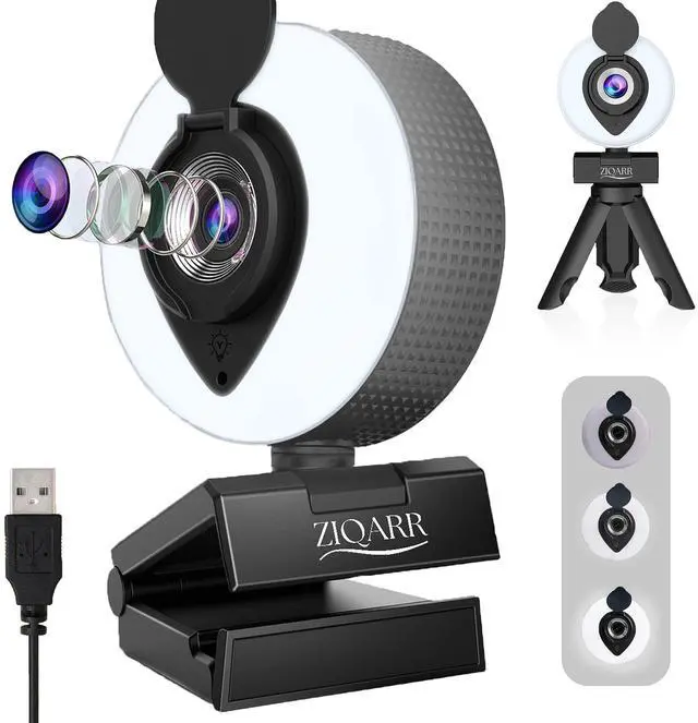 Ziqarr FHD 1080p All-in-One Webcam with Light and with Built-in Noise Reduction Microphone, Privacy Cover, Mini-Tripod and 110° Field of View for Streaming, Conferencing, Meetings and Gaming