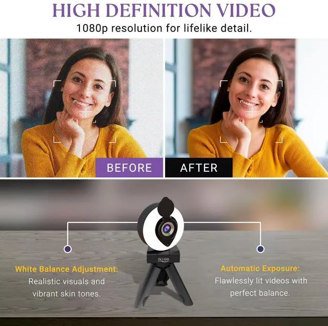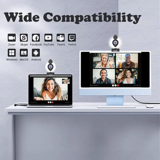 BUILT-IN PRIVACY COVER & TOUCH CONTROL 3 LEVEL RING LIGHT (HIGH LUMINOSITY) - Our webcam with light features an adjustable ring light for use in low light, with touch control for easy adjustments. It also includes a built-in privacy cover for security when not in use, ensuring peace of mind. The physical privacy cover also protects lens from fog and dust.