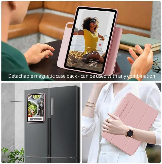 360° Adjustable Angles: The inner shell is lightweight and has built-in magnets, which can magnetically attach the iPad to the outer shell or any iron metal surface, such as a refrigerator. The outer shell adopts a tri-fold design stand and supports 9 different folding methods, allowing you to easily store it and get different viewing angles