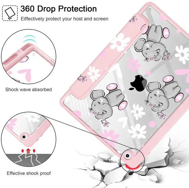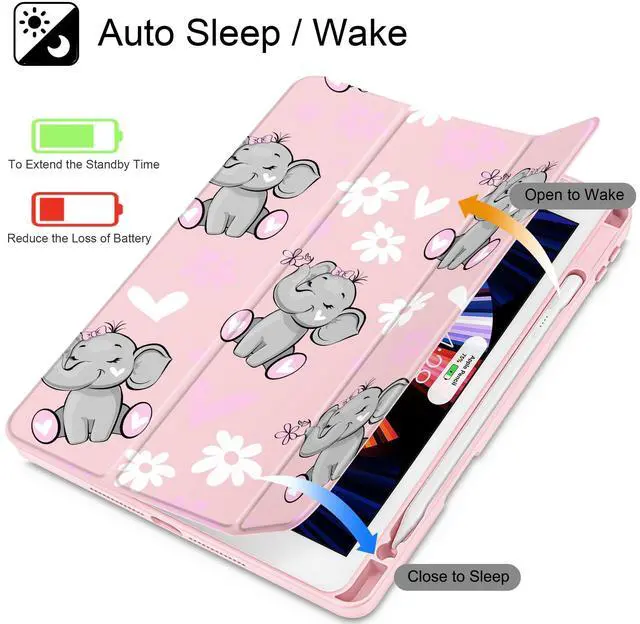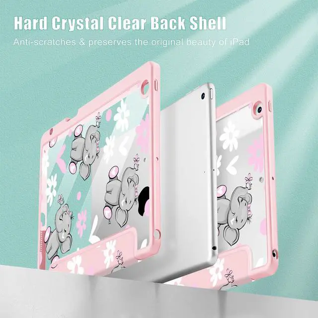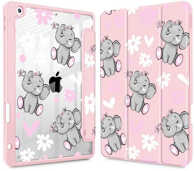 May Chen for iPad 9th Generation with Pencil Holder, iPad 8th/7th Gen Case 10.2-inch, [Penceil Holder] Trifold Stand Auto Wake/Sleep Clear TPU Protection Back Cover, Cute Elephant