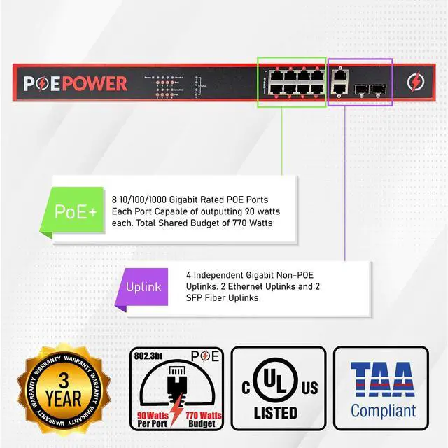 Built in a durable design, UL Listed, and TAA Compliant, the switch is backed by a 3 year warranty. It is suitable for residential, commercial, and enterprise level projects where reliable power and speed are essential.