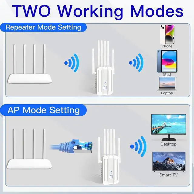 Two Modes: This WiFi extender signal booster features 2 flexible operation modes to adapt to suit different needs. Repeater mode extends the range of your existing WiFi network for broader coverage. AP mode transforms your existing wired network to wireless.