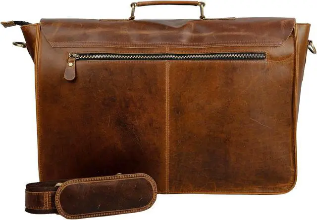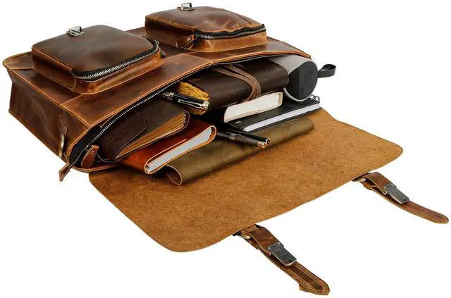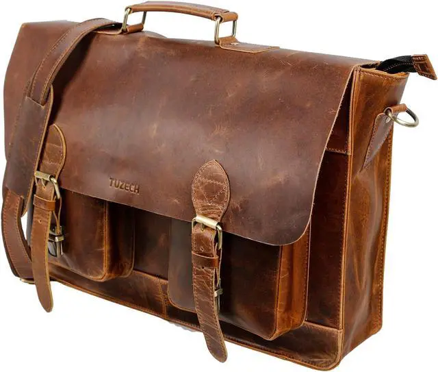 Item details Handmade Material Leather Made from the finest 100 % Genuine Hunter buffalo leather and lined with high quality canvas., Big pocket to accommodate Ipad's files etc. Cards / phones and pen section inside, 1 external metal zipper for convenience. 2 big front pockets to carry cellphones/ wallets / small books etc / Designed by Tuzech Can be used as a laptop bag, leather messenger bag, leather briefcase, courier bag Rustic Vintage look, concealed snap closures for easy access, adjustable shoulder strap. Padded compartment for Laptop's.