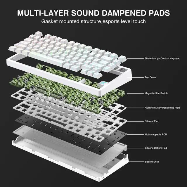 HALL EFFECT MAGNETIC SWITCHES: Utilizes LEOBOG starburst magnetic switches that utilize the hall effect to record keystroke operations. 0.1ms ultra-low latency makes it possible to eliminate physical contact between the keycaps and the switches, thus increasing the responsiveness of the keyboard.
