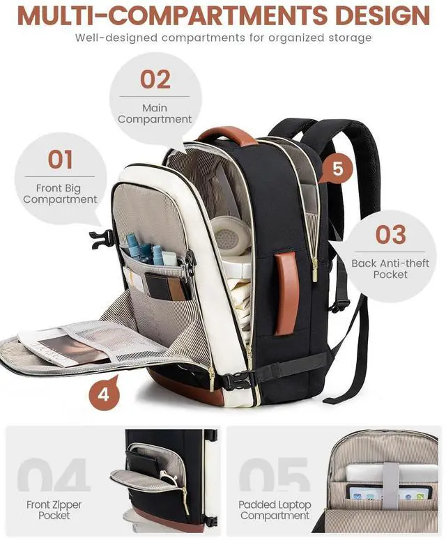 Large Capacity With Great Organization : This travel backpack boasts a generous 40L capacity, perfect for 3-5 days of travel essentials. 3 Big compartments and 18 pockets, ensuring everything is neatly organized. A dedicated and padded compartment fits a 17.3-inch laptop for maximum safety. The elastic band water bottle pocket securely holds a 500ml bottle. This versatile construction design makes this backpack perfect for travel, business trips, weekend getaways, and everyday use.