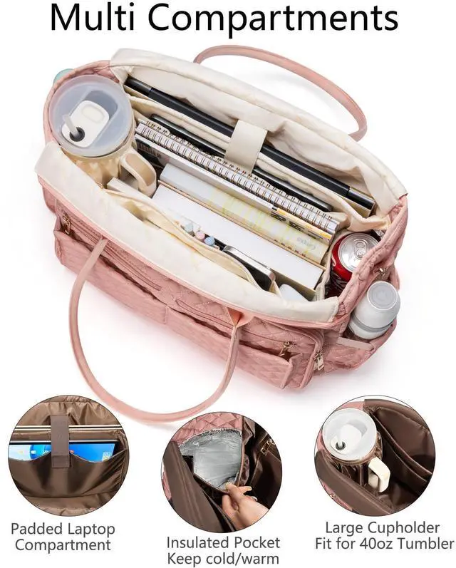 Teacher Tote Bags for Women, 15.6 inch Laptop Work Tote Nurse Bible Bag With Large Cup Holder & Insulated Pocket Quilted Shoulder Handbag Laptop Briefcase for Work, Daily, School, Travel, Gifts