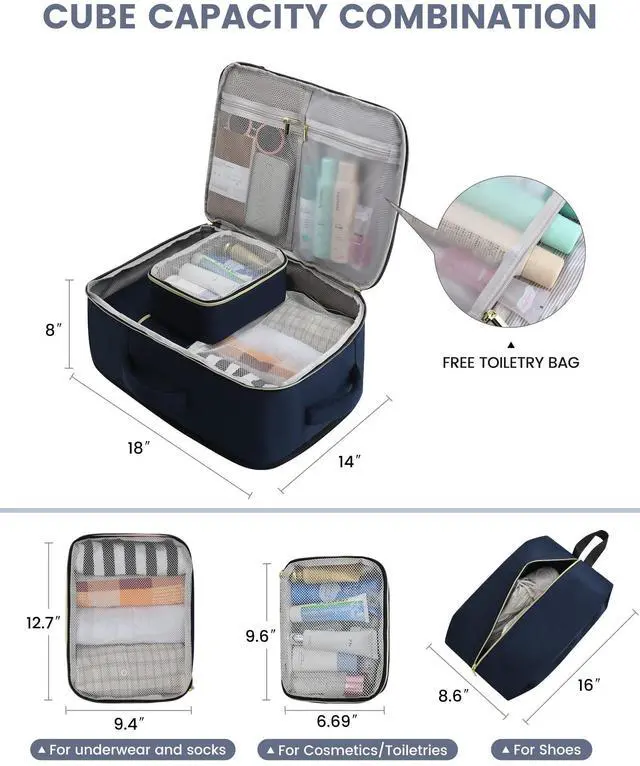 Keep It Clean and Dry Along with 2 packing cubes and an isolated shoe pouch, our backpack features a built-in wet bag. Made of high-density waterproof material, it's perfect for your damp clothes or toiletries, ensuring everything else stays dry.