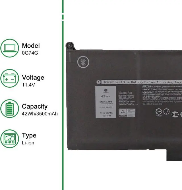 Model: 0G74G // Voltage: 11.4V // Capacity: 42Wh 3500mAh // Color: Black // Type: Plug & Play Li-ion Battery.