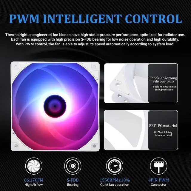 [Double PWM Fans] With TL-C12CW-S ARGB balanced fan x 2, speed up to 1550RPM±10%, size 120*120*25mm, noise25.6DBA, interface: 4pin PWM, air pressure: 1.53mmH2O(MAX), air volume: 66.17CFM(MAX), S-FDB bearing can solve the problem of hanging mode with PWM and ARGB function,the speed can be adjusted automatically according to the CPU temperature, which can p