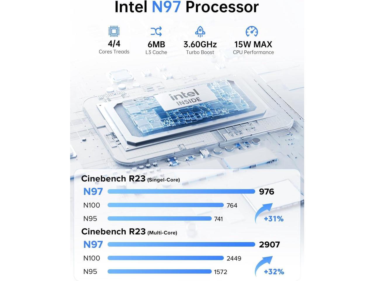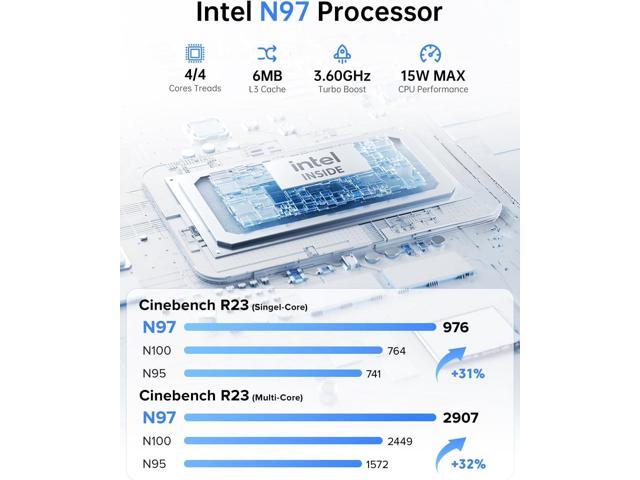 - 12th Gen Alder Lake N97 Processor: Faster Than N100/N95 Powered by the 12th Gen Alder Lake N97 (4 cores/4 threads, up to 3.6GHz, 6MB cache), this mini PC outperforms N100/N95 chipsdelivering 27%+ faster overall performance and 21% better GPU speed. It handles multitasking, office work, and home entertainment smoothly, with a 15W low TDP for power efficiency.