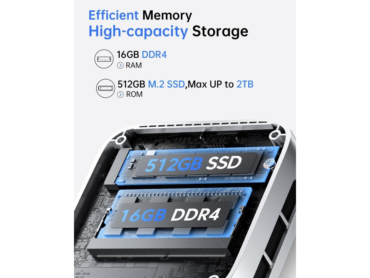 - 16GB DDR4 + 512GB SSD: Smooth Runs & Expandable Storage 16GB DDR4 RAM ensures lag-free multitasking, while the 512GB M.2 2280 SSD enables fast app launches and file transfers. Need more space? Upgrade to a 2TB M.2 NVMe/SATA SSD (M.2 2280 compatible) for large media or work files.