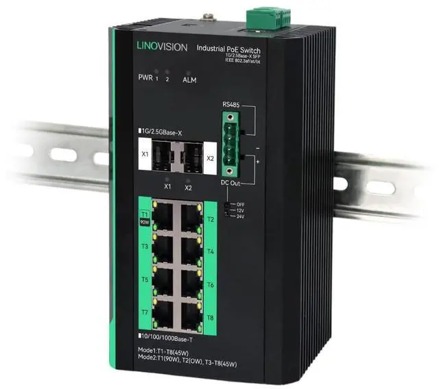LINOVISION Industrial 8 Ports Gigabit Managed PoE Switch with DC12~57V Input, L2 Management, RS485 Serial Port, DC 12/24V Output, BT 90W Output
