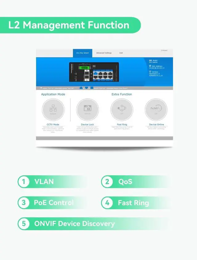 LAYER 2 MANAGED PoE SWITCH - Provides 8 * 10/100/1000Mbps Ethernet RJ-45 ports, 2 * 1G/2.5Gbps SFP uplink ports. Supports L2 management functions like VLAN, QoS, PoE Management and PoE port control, as well as automatic ONVIF cameras discovery. It can be managed via WEB, CLI or SNMP.