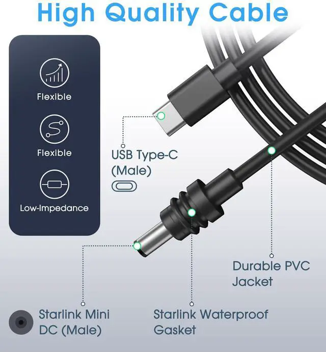 OUTPUT: Our Starlink MINI USB-C to DC power cable features an integrated PD Smart Receiver Chip. When connected to a compatible 20V PD Type-C power supply, the chip communicates with the power supply's source chip to ensure a stable 20V output on the DC barrel jack.