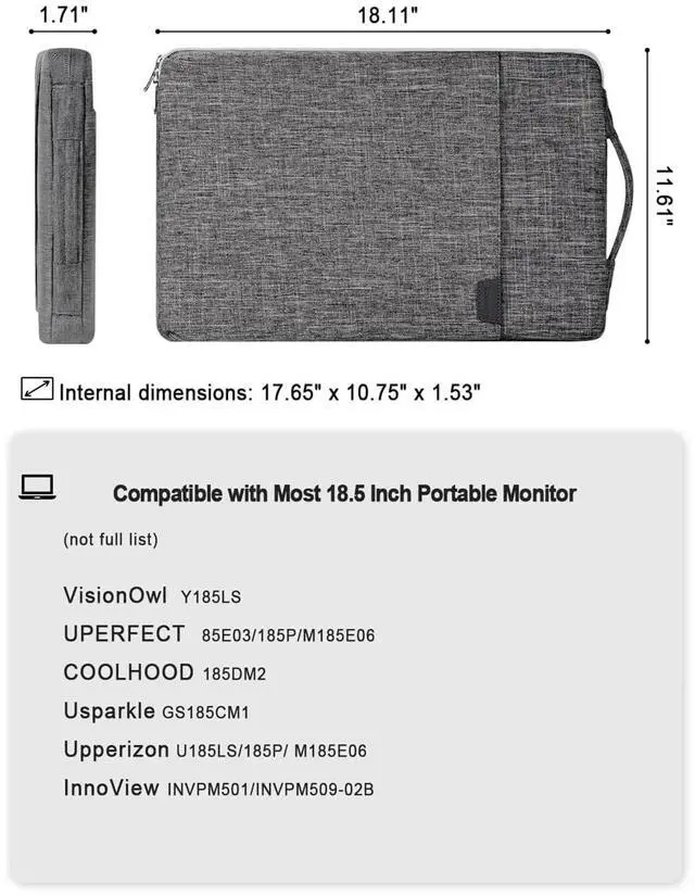 [Wide Compatiblity]: Internal dimensions-17.65 inches x 10.73 inches x 1.53 inches. Specifically tailored for portable display monitor, compatible with KYY ARZOPA VILVA MNN ForHelp KEFEYA InnoView Ingnok UPERFECT, etc and most 18.5Inches portable display monitor