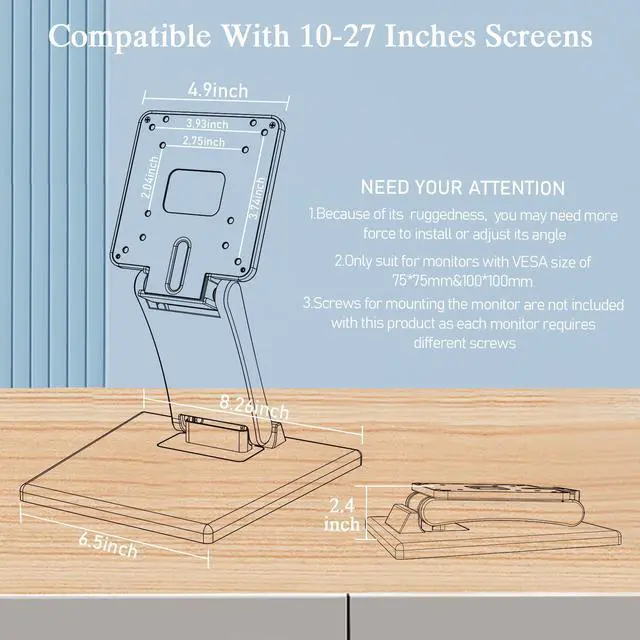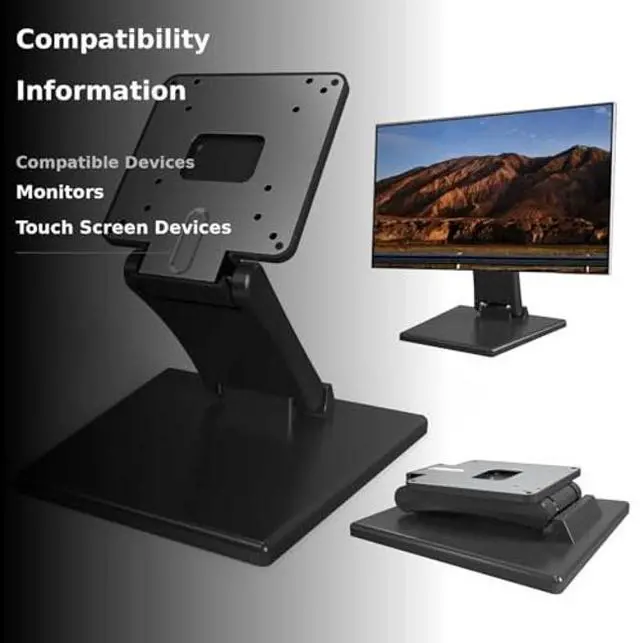 VESA Monitor Mount StandOur vesa monitor stand suits for vesa compliant monitors with 75*75 or 100*100mm VESA HOLES. The vesa adapter could be adapted to 10-27 inches LCD monitors or other touch screen devices with vesa holes.