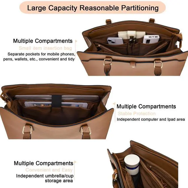 2.12 Pockets for Ultimate Organization:Dedicated thermos holder, mouse pocket, quick access phone slot/work notebook/pen/glasses slots, and separate compartments for tablets and cosmetics,Fits A4 files, Pad, power bank and daily essentials.Matching makeup wristlet clutch purse.