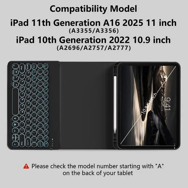 Compatibility Model: This iPad wireless keyboard case is designed for iPad 11 Inch A16 2025 11th Generation(Model Number: A3355 A3356), iPad 10th Generation 2022 10.9 inch. ( Model: A2696/A2757/A2777 ). NOT compatible with any other iPad models. Please check back bottom of your iPad to find the model number
