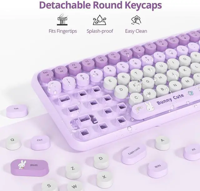 Owpkeenthy Cute Purple Keyboard and Mouse Wireless, Colorful Keyboard Retro Typewriter Style Full-Sized with Number Pad Round Keys for Desktop, Laptop and Computerr (Bunny Purple)