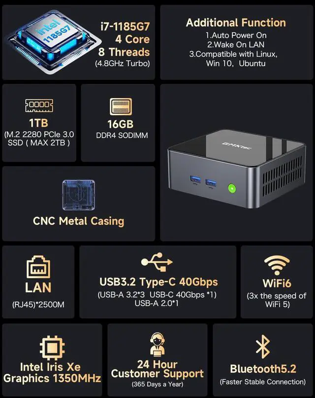 Powerful PerformanceGMKtec M2 Pro S mini computer is equipped with 11th generation Intel Core i7-1185G7 processor, main frequency up to 4.8 GHz, 4 cores, 8 threads, 12MB cache, running much faster than i7-10810U, i5-12450H and i5-8259U, Wins PC series The power is only 35W, supporting your daily work with less power consumption, without delaying daily tasks
