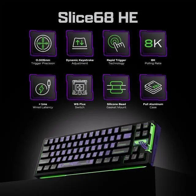 8000Hz Polling Rate: The Slice68 rapid trigger keyboard boasts an 8000Hz polling rate and 32K scanning rate that effectively reduces keyboard latency to a mere 0.125ms. Say goodbye to input lag and take control of speed, your esports performance will be fast responsiveness. For gamers, performance is always more important than anything else