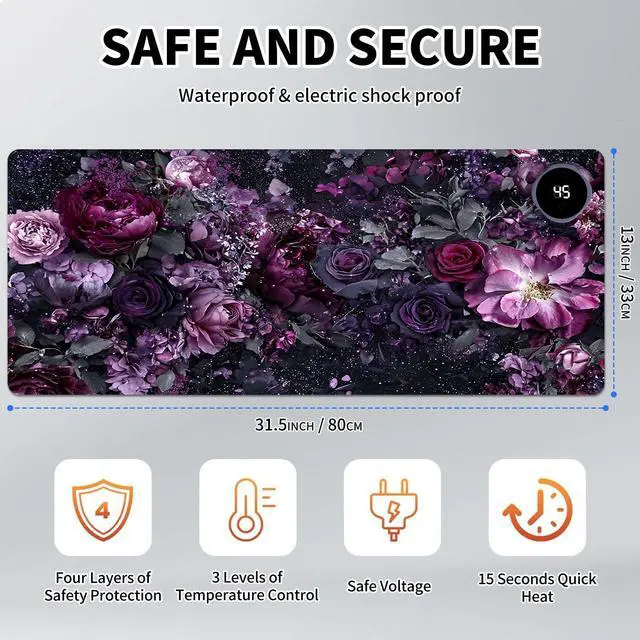 Heated Mouse Pad Hand Warmer, Warm Desk Pad Mousepad Desk Mat with 3 Levels Heating and Auto Shut Down 31.5 x 13 inch PU Leather Warmer Keyboard Mat for Gaming Laptop Office Home, Purple Flower