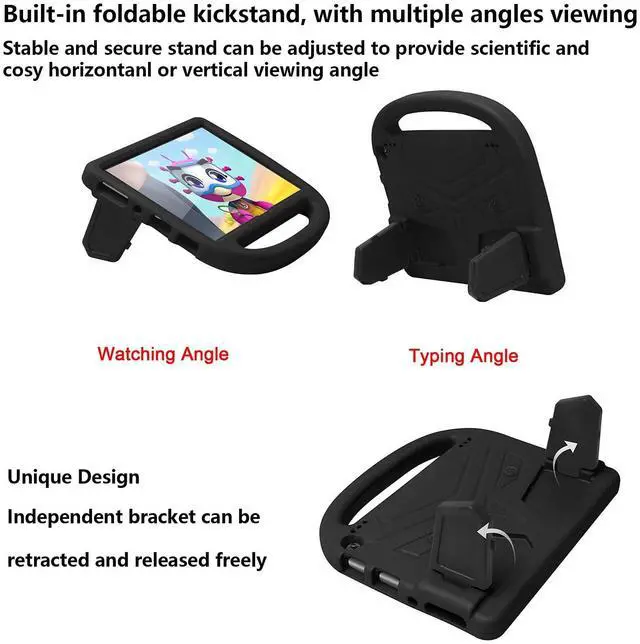 Kicksatnd: Unfolding the 2 fun kickstands of the back to stand up your tablet. The stand case fold to support the tablet for viewing video mode and typing keyboard mode.