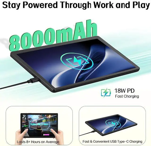 Eye comfort mode is adjustable, helping to protect your vision during long sessions a great choice for students, professionals, or anyone seeking a reliable tablet for adults. Stable Wireless Connectivity Stay connected with dual-band WiFi ( 2.4GH z/5GHz) and Bluetooth 5.0, ensuring fast, stable internet and smooth pairing with accessories like keyboards, earbuds, or speakers. Whether at home, work, or on the go, this wifi tablet makes online activities seamless and efficient. Long Battery Life & Clear Cameras Equipped with a powerful 8000mAh battery and support for 18W PD fast charging, this gaming tablet and multimedia device keeps up with your day.