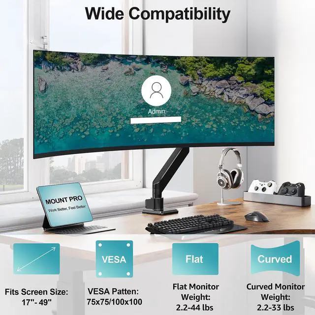 Universal Compatibility - MOUNT PRO single monitor mount holds ultrawide screens up to 49", compatible with flat displays weighting up to 44 lbs and, supporting both 75x75mm and 100x100mm VESA patterns. The computer monitor stand works with flat or curved displays, including heavy-duty models like the Samsung Odyssey G9 and LG ultra wide monitors.. ^^ Full Motion Control - This vesa monitor mount's arm can be raised to 17.3" and extended to 21.7". Additionally, it can rotate 360 from portrait to landscape, swivel 180 to view the screen from various sitting positions, and tilt up to -90 or +90 to reduce screen glare.