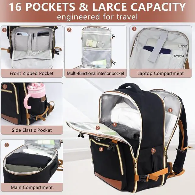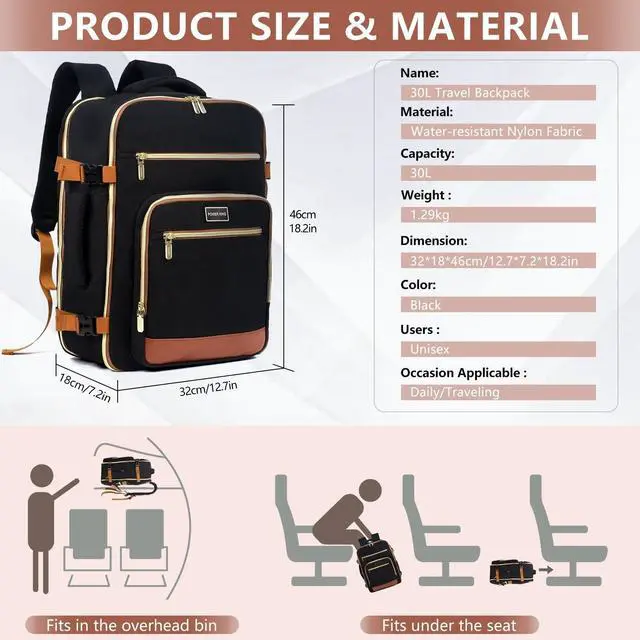 It is very easy to carry on most flights. ^^ Large Capacity Multi-pocket BackpackThis extra large travel backpack with a 30L capacity, 2 main compartments, and a lot of pockets. Spacious enough to hold 5-8 garments, books, a laptop, shoes, and other daily essentials. It is very suitable for men, women and weekend travelers. ^^ Practical & ComfortableThis carry-on backpack features high-quality nylon fabric thats tearproof, water-repellent, and abrasion-resistant for long-lasting use. The back and the adjustable shoulder strap are both equipped with breathable sponge mesh pads, which not only reduce the pressure of carrying but also enhance ventilation and air permeability.