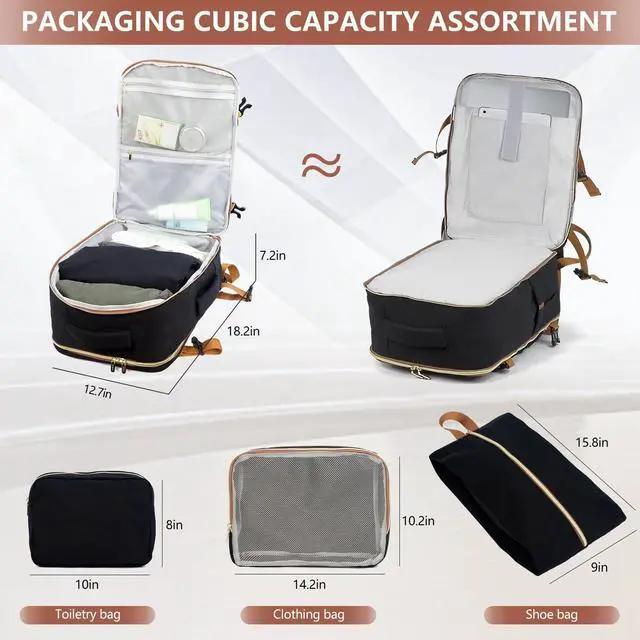 With 3 Extra Storage Bags & Wet PocketsThe carry on backpack has a built-in wet compartment pocket and 3 storage bags ( 1 tolietry bag, 1 net bag, 1 shoe bag). They are great for storing wet clothes, towels, and toiletries when packing for a trip, It can not only achieve dry-wet separation but also prevent moisture from affecting other items. ^^ Flight Approved Laptop BackpackDimensions 18.2 * 12.7 * 7.2 in. Light weight 1.29K g ( 2.8 lb). 180-Degree Zipper Closure for swift security check passage. This carry-on backpack fits perfectly under the seat or in the overhead bin.