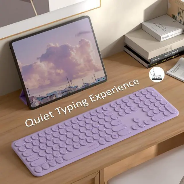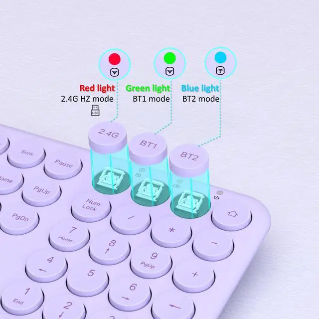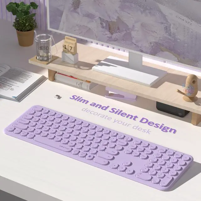 SCISSOR - SWITCH KEYBOARDThe keyboard features scissor-switch keys that provide a smooth and responsive typing experience, with low-profile keys that are comfortable to use for long periods ^^ SLIM DESIGNThe keyboard has a slim and lightweight design that makes it easy to carry and use on-the-go, without taking up too much space on your desk ^^ SOLID COLORThe keyboard comes in a solid color, giving them a sleek and modern look that is perfect for both professional and personal use ^^ ROUND KEYCAPSThe keyboard has round keycaps that provide a unique look and feel, while also reducing the amount of noise generated when typing ^^ 2 WAYS CONNECTIONThe keyboard provides 2 kinds of connections ways, one is bluetooth another is 2.4GH z wireless USB receiver.