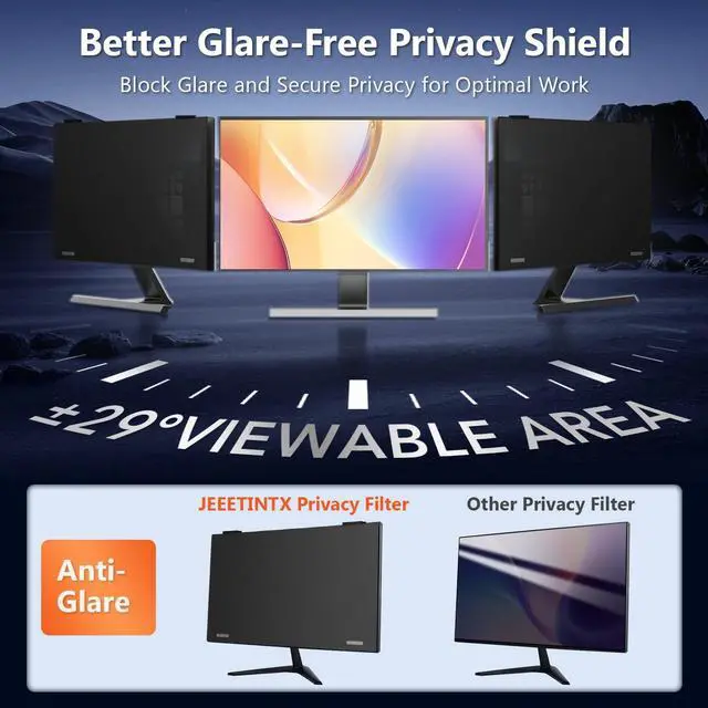 Note: dimensions exclude the bezel and Not suitable for curved monitor. ^^ 4th Generation Magnetic DesignThe 4th Generation Magnetic Design offers cutting-edge screen protector technology for seamless, secure attachment to devices. JEEETINTX 27 privacy screen for monitor provides easy installation and removal while ensuring stability. Users enjoy a clutter-free workspace and the convenience of quickly swapping screens as needed. ^^ 6A Enhanced MaterialsOur computer privacy screen 27 inch integrates six specialized layers into one design. It enhances privacy, filters harmful light, resists dust, minimizes motion blur, and ensures a bubble-free application. These features improve visual clarity and user comfort for a superior viewing experience. ^^ 29-Degree Extreme Privacy Viewing AngleWith a 29-degree privacy angle, the monitor privacy screen 27 inch appears darkened from side angles, protecting sensitive information. This is ideal for public spaces where privacy matters, such as offices or cafes. ^^ HD Eye ProtectionDesigned for HD eye protection, our 27 inch monitor privacy screen delivers clear visuals while safeguarding eyes from prolonged screen exposure. Protective layers against blue and UV light ensure a comfortable and healthier computing experience, suitable for daily and professional use.