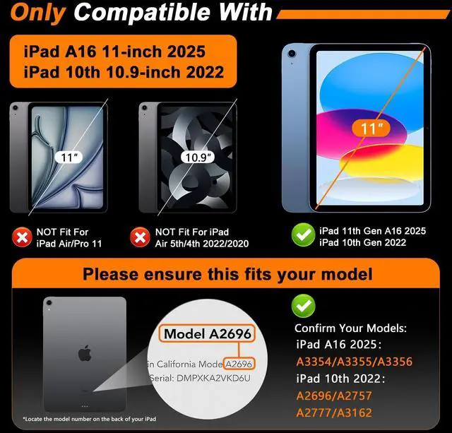 Perfect Compatibility: Designed exclusively for iPad A16 11th Gen 2025 (11inch) and iPad 10th Gen 2022 ( 10.9 inch) models: A3354/A3355/A3356/A2696/A2757/A2777, with full Apple Pencil support. Always verify your iPad's model number (on back cover) before purchase ^^ Easy