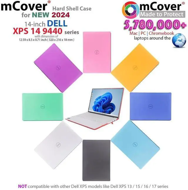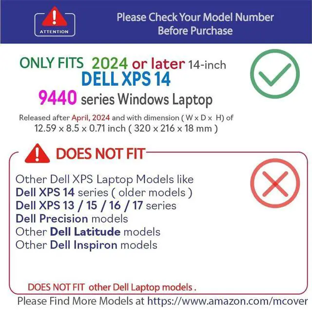 NOTE: Before placing order, PLEASE make sure to verify your laptop model number as this case is MODEL specific and NOT interchangeable. ^^ NOT fitting other Dell XPS 13 / 14 / 15 / 16 / 17 laptops. NOT compatible with ANY other Dell laptops as well. ^^ Made of high-quality translucent polycarbonate material which is shatter-proof and will protect your 2024 or later 14.5" Dell XPS 14 9440 series non-2-in-1 Windows Notebook Computers all around ^^ Designed to perfectly fit the 2024 or later 14.5" Dell XPS 14 9440 series Windows Notebook Computers with dimension of 12.59 x 8.5 x 0.71 inch ( 320 x 216 x 18 mm ) ^^ 2-piece light-weight ( 8.9 oz or 252 g ) shell easily snaps on and off.