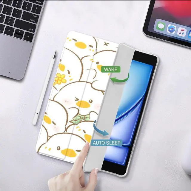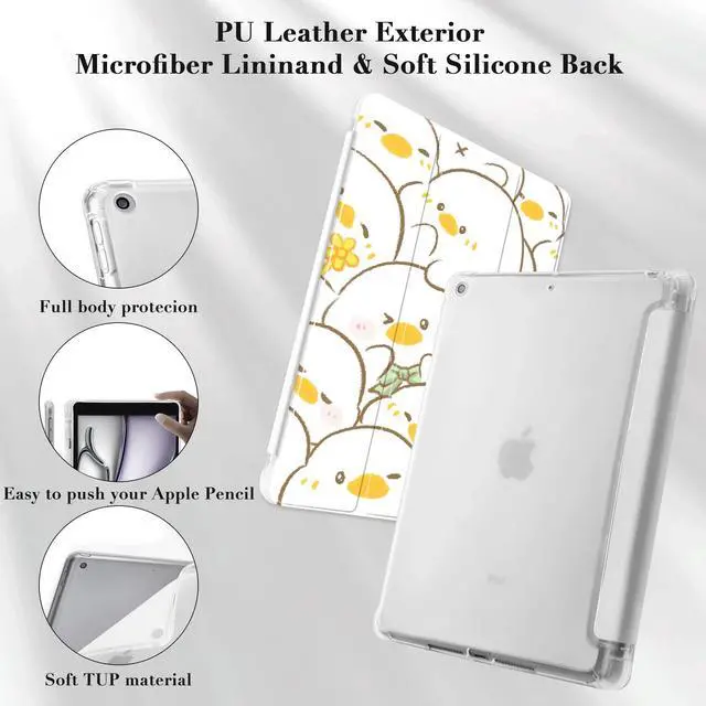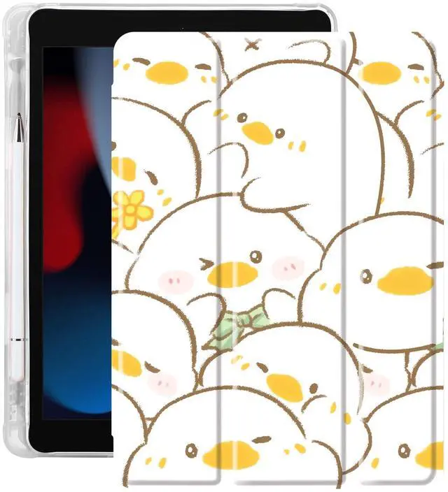 Idocolors Cute Kawaii Duck Pad Case for 10.2 Inch iPad 9th/7th/8th Gen, Clear TPU Trifold Stand Back Cover with Pencil Holder, Auto Wake/Sleep Protective Case for iPad 2021/2020/2019