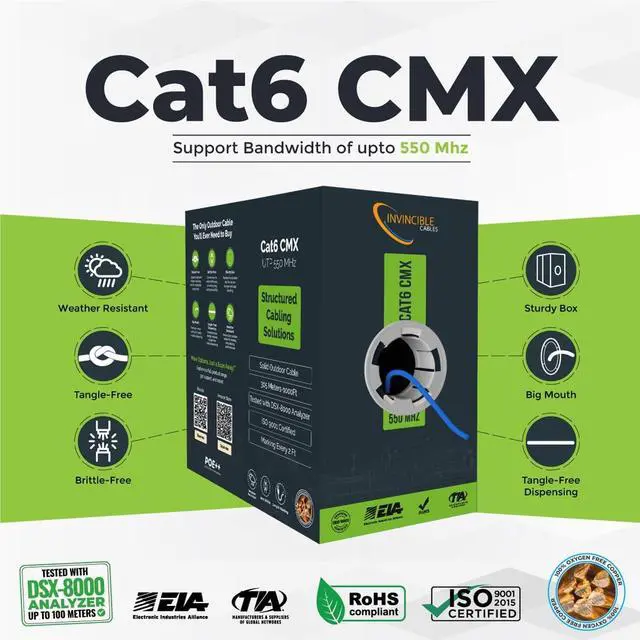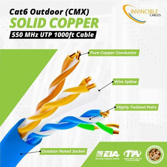 ^^ -: Our Cat6 CMX-rated Ethernet cable is designed for outdoor environments with 100% solid copper conductors for superior durability and conductivity. Engineered to withstand harsh weather conditions, it meets ANSI/TIA 568.2 -D standards and is RoHS-3 compliant. Backed by a FOREVER WARRANTY, this cable provides a reliable and long-lasting solution for your outdoor networking needs, giving you peace of mind and a solid investment in your infrastructure. ^^ - - -,: Streamline your outdoor installations with our Cat6 CMX-rated Ethernet cable, packaged in a tangle-free, easy pull box. This cable features robust, weather-resistant insulation and easily identifiable color-striped 4-pair UTP (Unshielded Twisted Pair) solid copper conductors. Sequential footage markings ensure precise usage tracking, making the installation process smooth and straightforward, even in challenging outdoor environments.