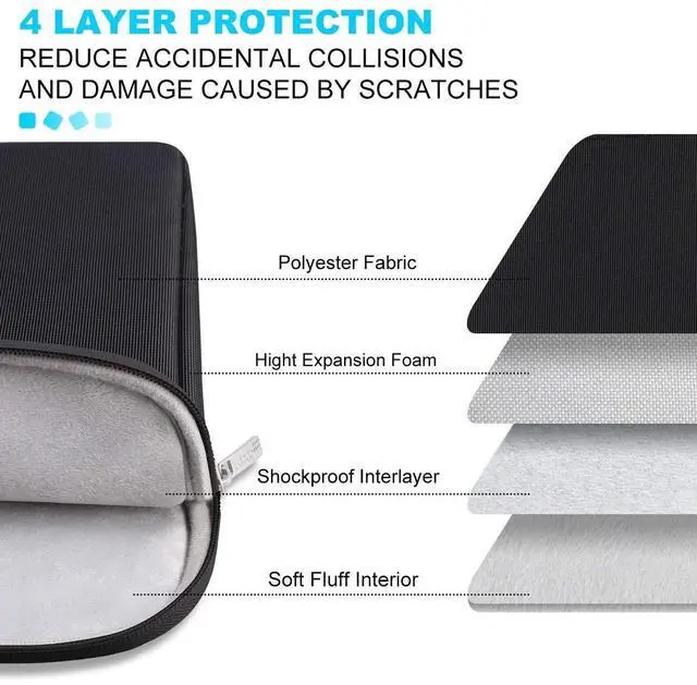 Laptop Protection: Adopt anti-scratch luxurious velour padding and shock-absorbent, high resilience buffer layers, offer a super barrier against accidental bumps and jolts, the laptop sleeve provide a ton of hydrostatic resistance to repel water from penetrating inside, shield your stuff from unexpected coffee spill, equipped with unique two-way zippers in smooth action, reinforced all stress points, ensuring that your valuable electronics is always in encompassing protection.