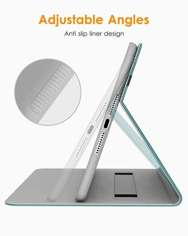 • Elastic Strap and Built-in slots - Able to set up multiple horizontal stand angles for comfortable facetime watching and typing.