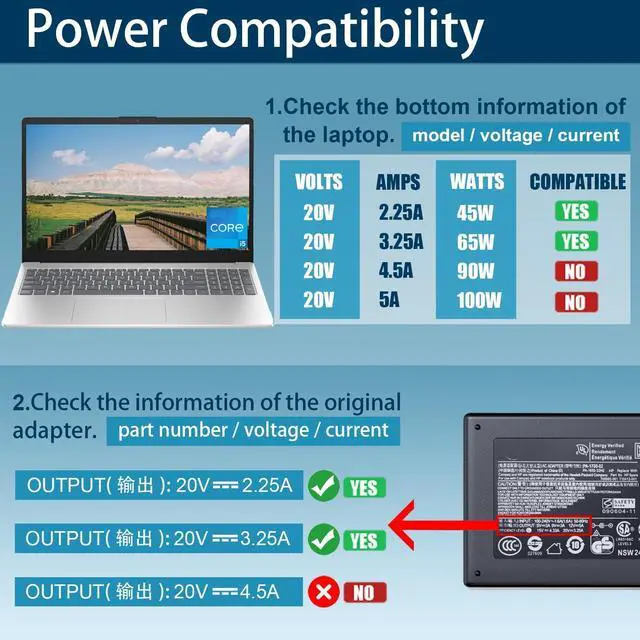 Product DescriptionOutput & Wattage: 20V- 3.25A 65W (Works with 20V- 2.25A 45W laptop)