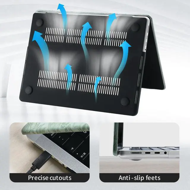 PRODUCT FEATURES: Slim Hard Shell Case can effectively protect laptop from fingerprint, scratches, shocks, drops and other damage. Adopting with premium pu leather material & special embossed process, featuring delicate texture and elegant appearance. Shockproof Case have two rows of bottom ventilation, allowing safe heat disbursement, help device staying cool. Four anti-slip rubber pads on bottom prevent slipping, keep your device firmly in place, more safe and stable in use. Precise cutouts full access to all controls and features. Totally removable, easy to put on and take off.