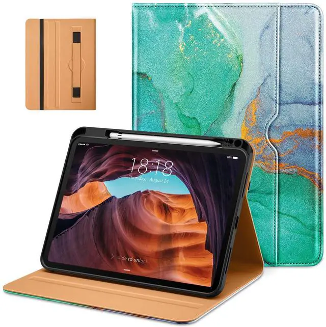 Number: A2757/A2777/A2696). Not compatible with any other model ^^ Built-in Pencil Holder - Securely carries and protects your pencil wherever you go. A hole has been designed at the back of the pencil holder that you can easily push pencil out without taking off your iPad 11/10 case ^^ Magnetic Smart Cover - Support Auto Wake/Sleep, built-in leather hand strap(one-handed operation) and external elastic band enhances magnetic closure ^^ Multi Function - Multiple horizontal bracket angles for comfortable watching movie or typing. Features front document card pocket to keep notes, cash, cards ^^ Premium Material - Exterior is made of premium synthetic leather, lined with microfiber provide full protection for your iPad 10th Generation, against impacts, drops and scratches