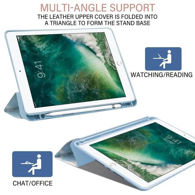 ^^ Muti-viewing AnglesThe case design of the tri-fold stand can change the angle to meet your viewing and typing needs, the lightweight design adds excellent protection to your device, the pattern used in this iPad series case allows you to tablet is more stylish and attractive. ^^ Sleep and WakeBuilt-in provides automatic sleep/wake function to save energy when the lid is closed. Cameras, speakers, ports and buttons, in precise cutouts allow full access to all ports and functions without removing the case. ^^ ReuseableThe iPad case is carefully processed and reusable.
