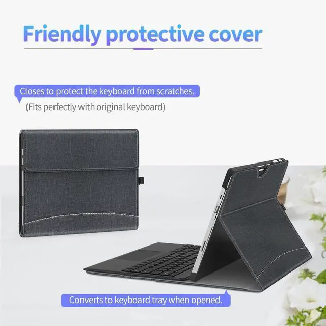 Comprehensive protection The flip cover opens to serve as a protective pad for the keyboard, fitting perfectly over the original keyboard and protecting it from scratches. When the flip cover is closed, the Microsoft Surface Pro tablet itself and the keyboard are secured by a magnetic closure protecting your device from damage. Its precise cutouts allow easy access to all controls and features, which provides all-around protection for the Surface Pro 7+/7/6/5/4 tablet